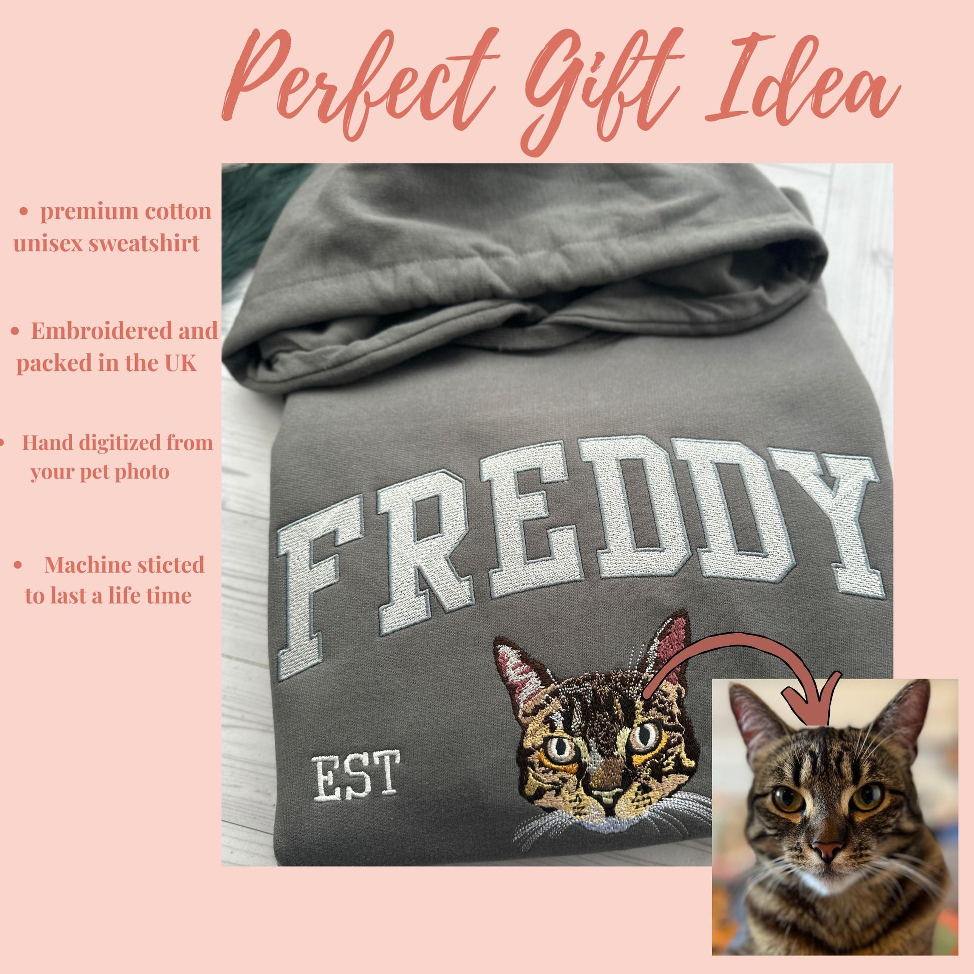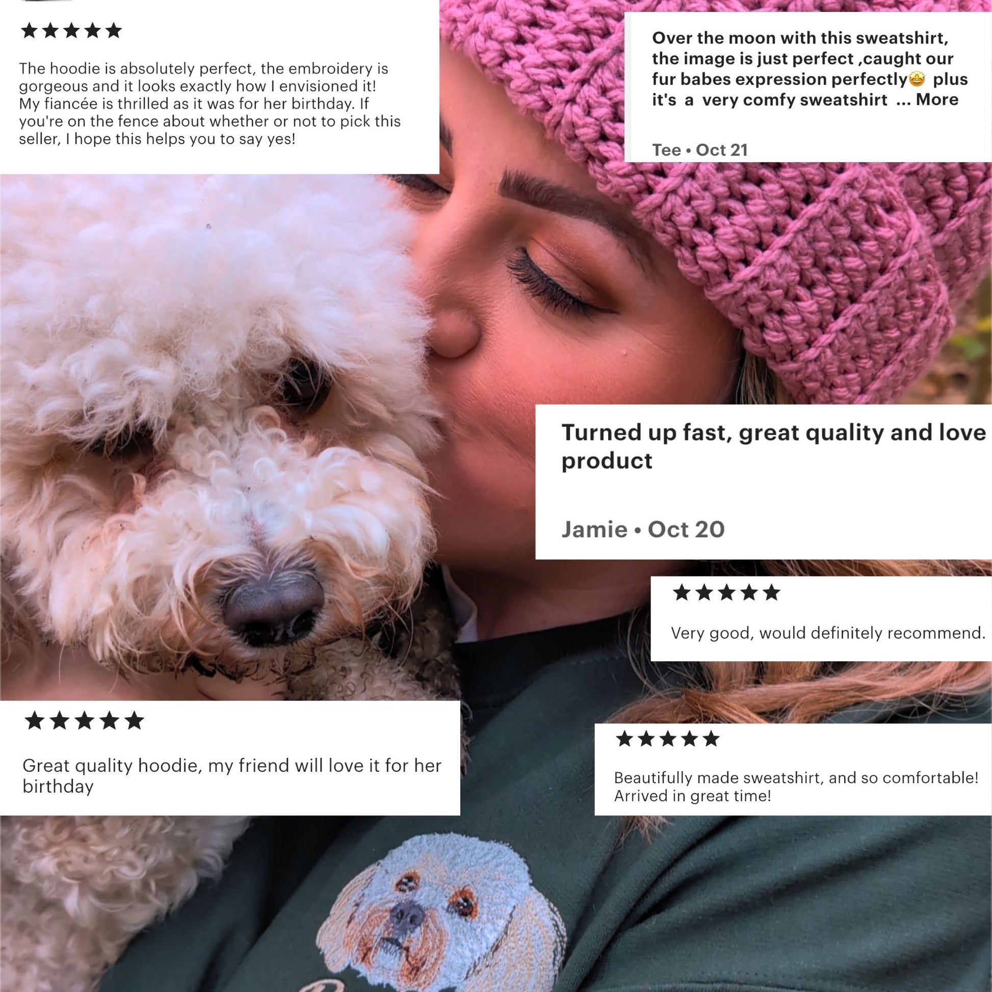 - Wrap yourself in warmth and cherished memories with our custom pet sweatshirt. Each cozy crewneck features a detailed personalized pet embroidery of your pet’s portrait and name, making it a one-of-a-kind keepsake that celebrates the bond you share. This sweatshirt isn’t just apparel